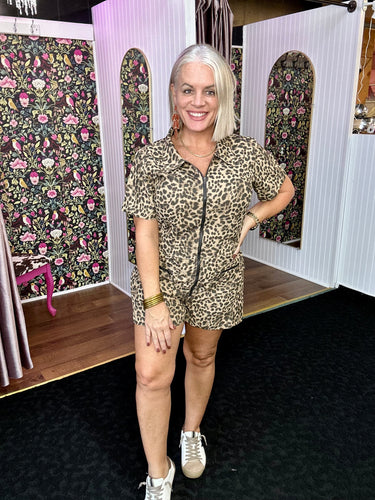 Clearance juniors Leopard Print Short Sleeves Romper with Zipper