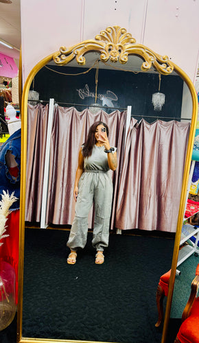 Gray Drawstring Waist Sleeveless Mineral Washed Jumpsuit