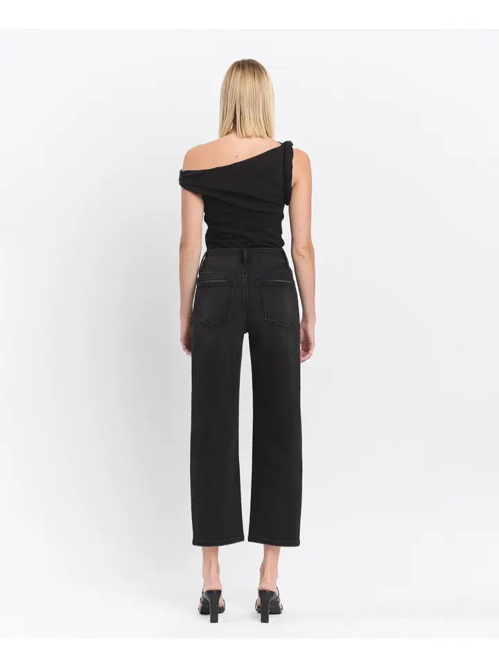 Super high rise wide barrel jeans Comfort stretch denim, super high rise, finished hem, cropped length, wide barrel jeans F. Rise: 11" / inseam: 27" / leg opening: 17" Model is 5'10" wearing a size 26.